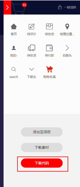 搜索“購物車”圖標—>點擊“添加入庫”–>點擊購物車進入購物車–>點擊下載代碼按鈕。