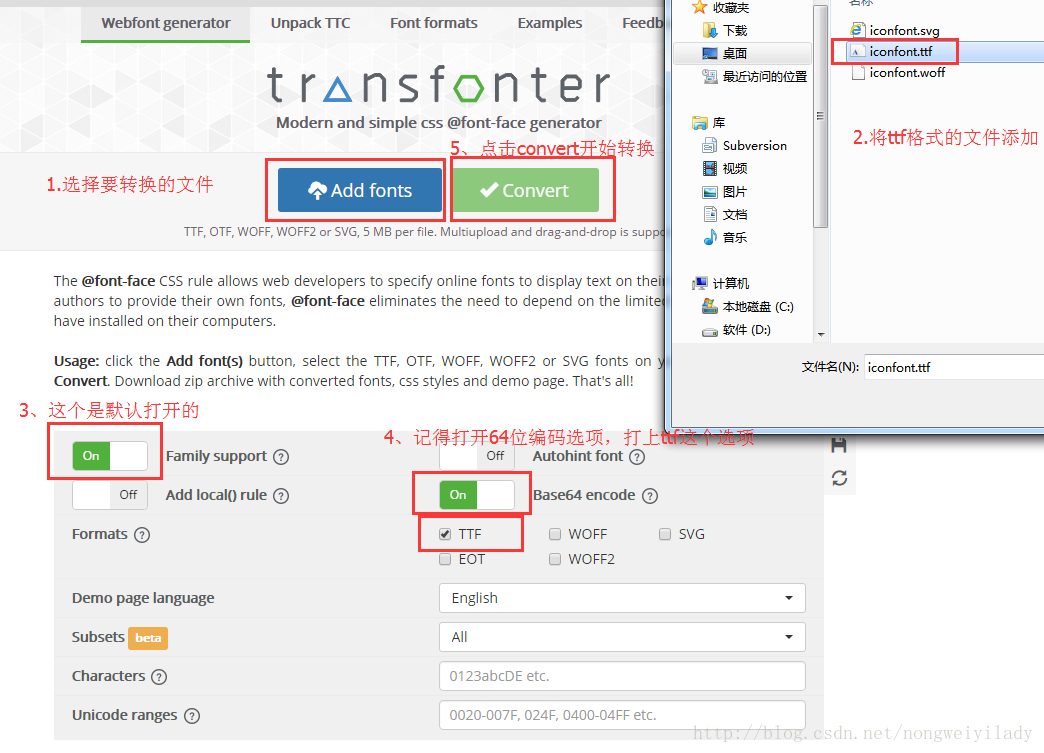 進入https://transfonter.org/平臺,將解壓出來的ttf字體文件轉化成base64格式。流程如下: