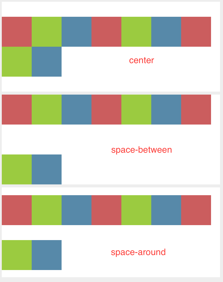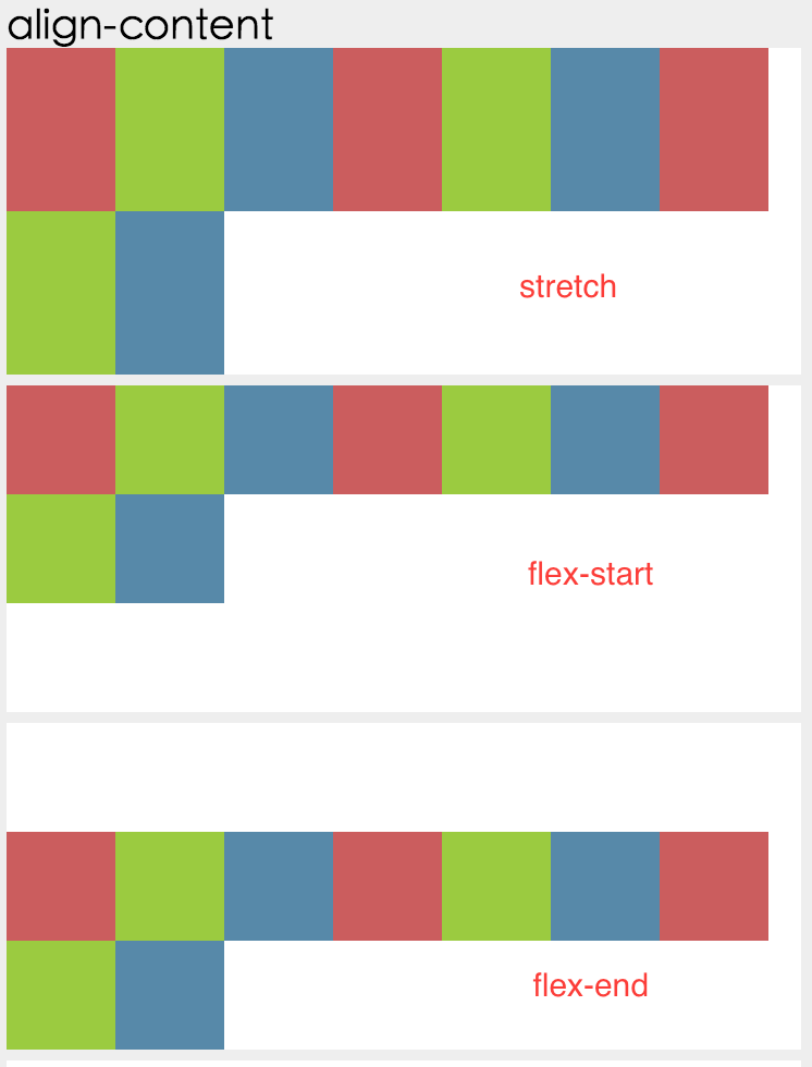 定義了多根主軸的對齊方式,如果項目只有一根主軸則不起作用,多根主軸一般會在主軸上折行時出現: